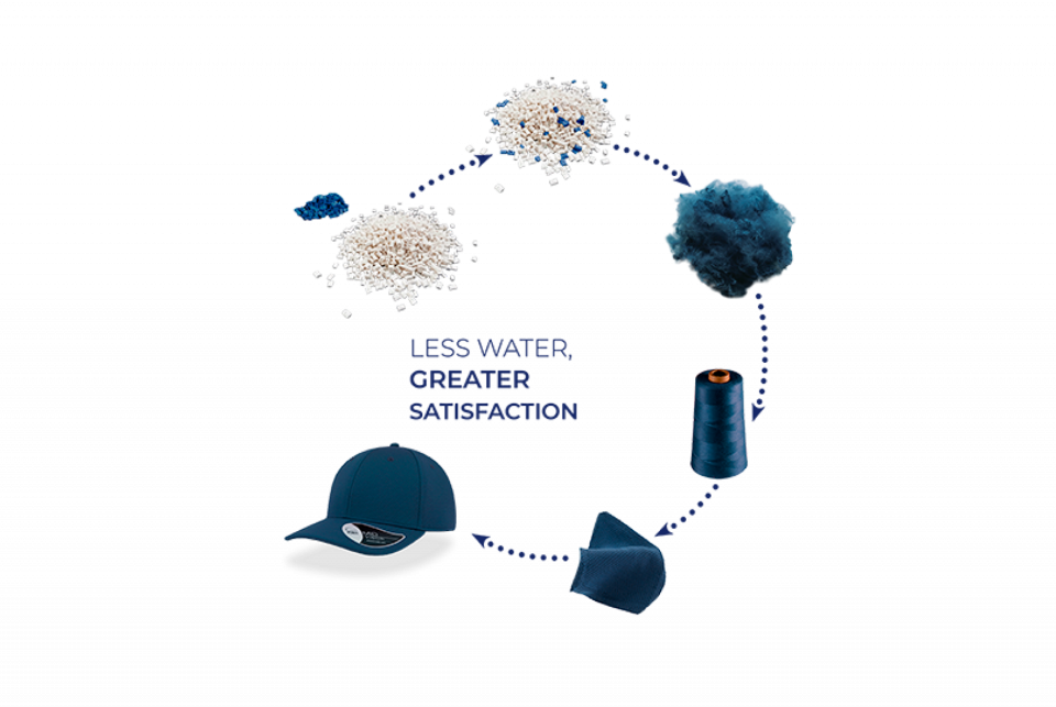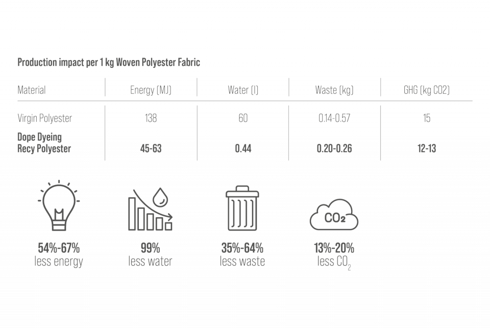 Dope dyeing, on the other hand, is a departure from traditional wet processing because of its reduced environmental impact. Typical of recycled polyester, it involves adding color pigments “upstream,” directly into the molten plastic solution before the fiber is made. Unlike traditional processes where yarns are made and then dyed, dope dyeing traps the pigments in the recycled plastic after it cools to a solid form and becomes part of the new, stronger yarn. With this approach, dyeing can be done by hot transfer without immersion in water.